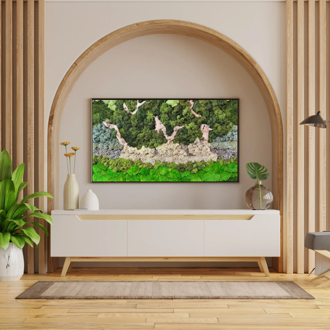 I work primarily with moss, paper-based clays, and cement, blending them in ways that feel both ancient and modern, earthy and alive.
